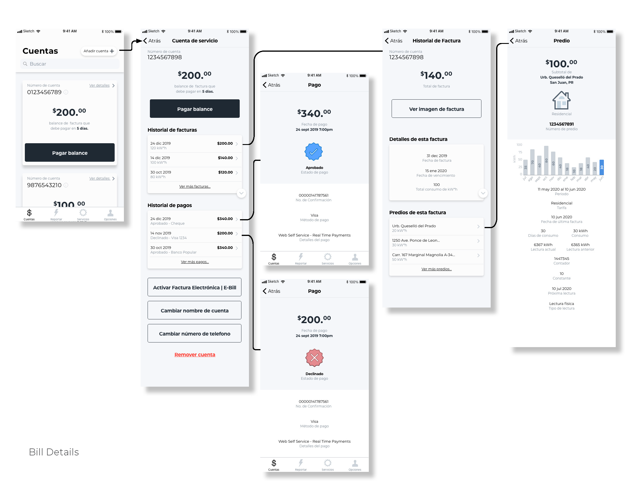 We designed the app doing multiple iterations. Addressing the user’s pain point for each of the services listed was one of the most important goals. We design the app in short sprints, going from low resolution versions to high resolutions for each service. We started with PREPA’s key transactions first, payment, and then moved to secondary and tertiary services.