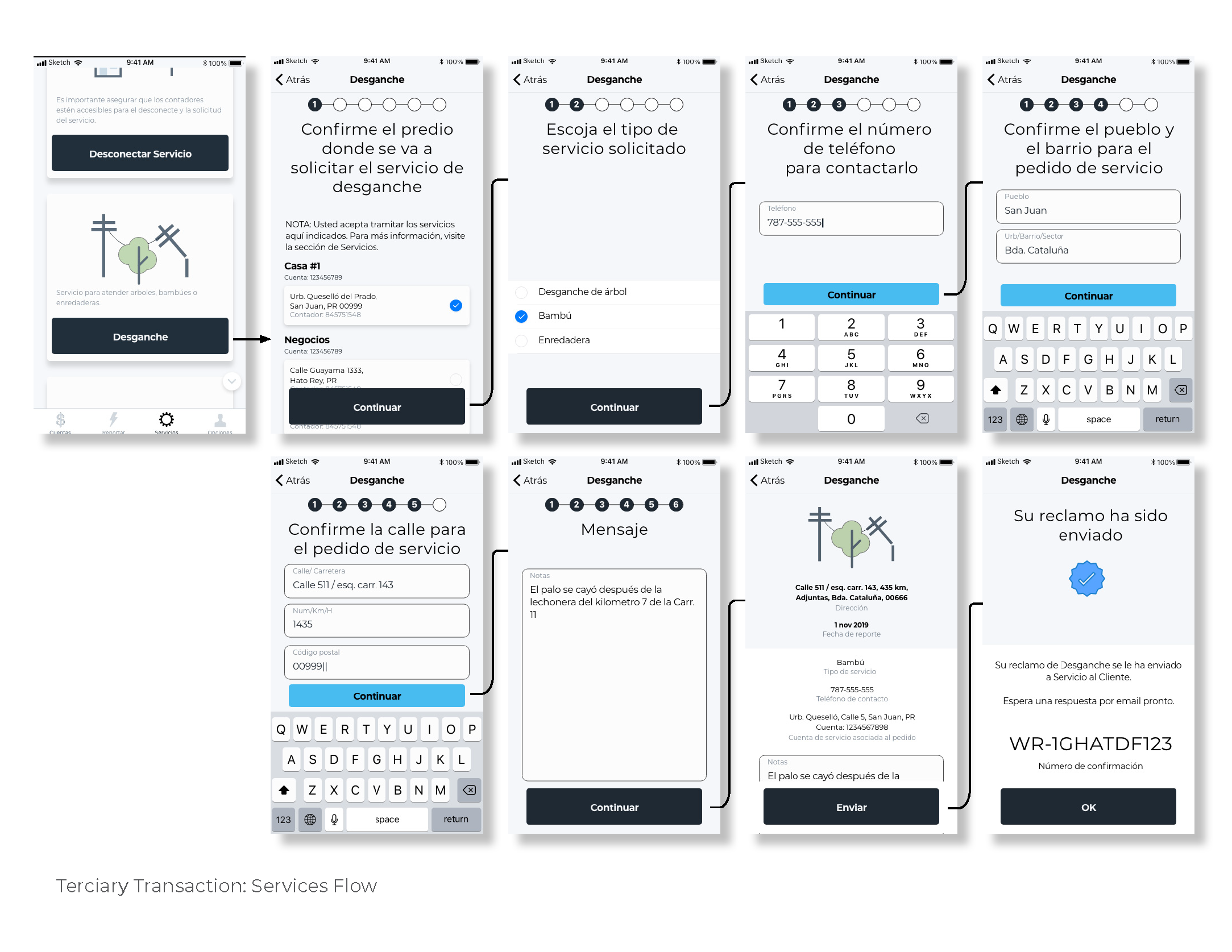 Secondary and Tertiary Transactions: Services were standardized to minimize user form. Whenever possible, addresses associated with premises were pulled from PREPA’s user database. A step counter was introduced after users complaint not knowing in what step in the process they were in. This design was used for all service requests.