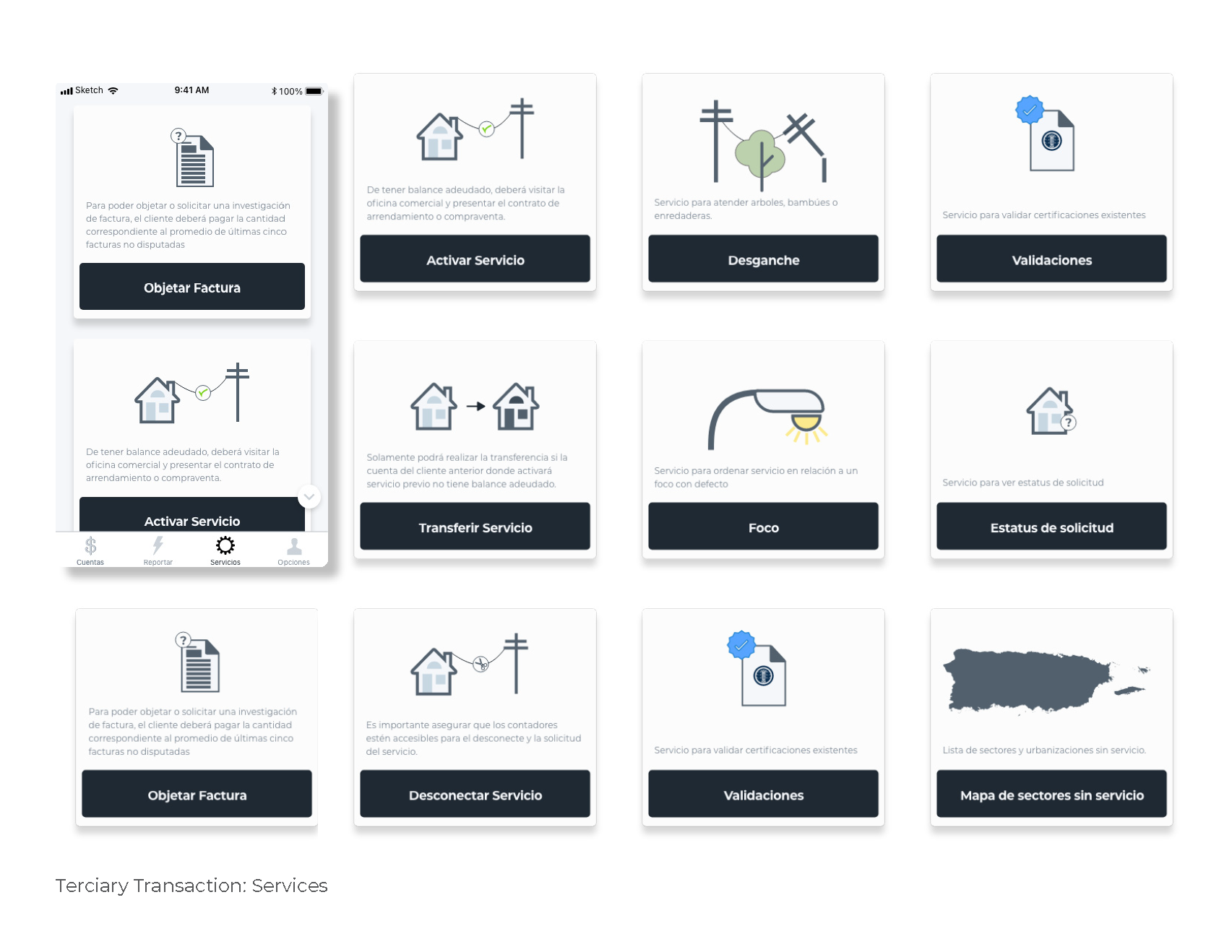 We took these lessons and stood up the rest of the app as a low-resolution version, presented the findings to PREPA and after addressing the UX findings. With the high-resolution design we reorganized the app around the metaphor of cards. Every service, information or action would be organized around a modular card with visual hierarchy for any information and call to actions. Finally, we decided that in order for the services card to look more inviting, we needed custom icons to capture the essence of the service requested.