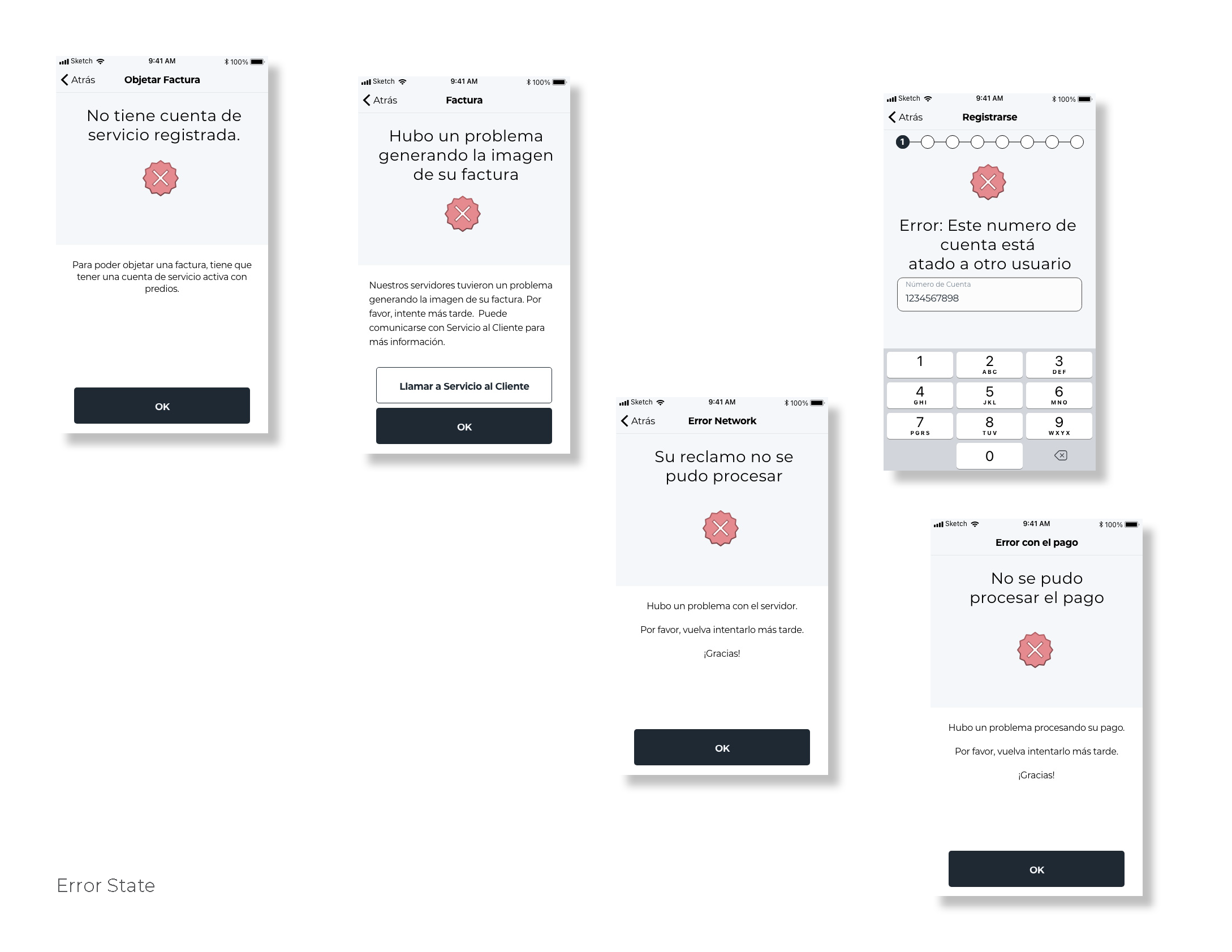 Errors and Exceptions: One of the challenges having a multi-service customer service platform is how to handle errors. A standard error icon was used to be shown at the moment the user input some erroneous data or a network request was not completed.